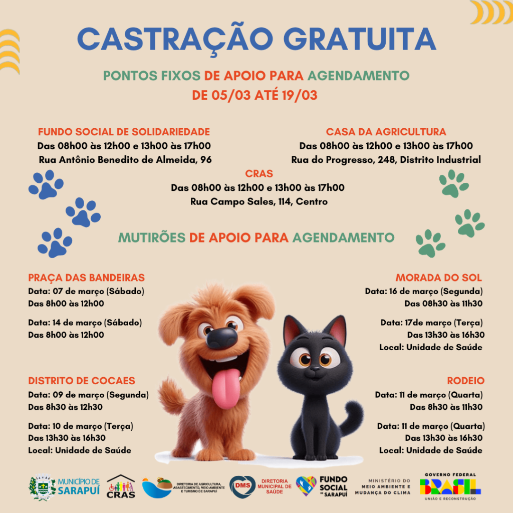 A Prefeitura Municipal de Sarapuí informa que estará realizando a Campanha de Castração Gratuita, com pontos fixos e mutirões de apoio para agendamento, no período de 05 a 19 de março.