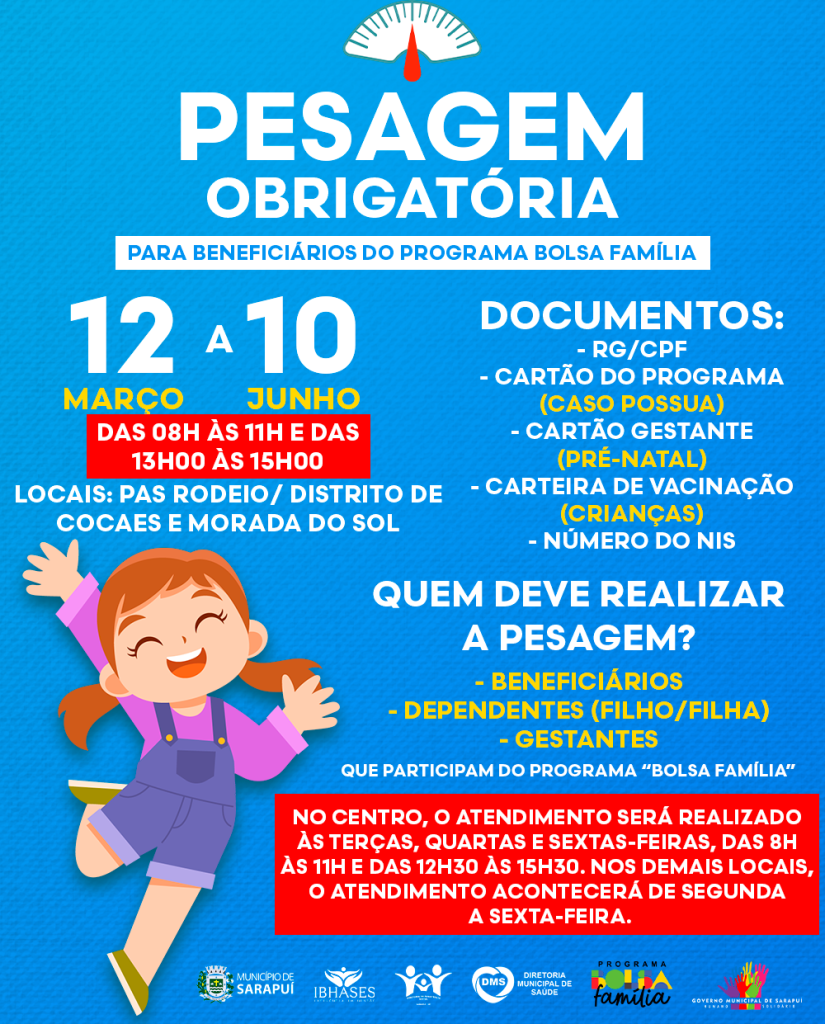 A Prefeitura Municipal de Sarapuí, por meio da Diretoria Municipal de Saúde e do Instituto IBHASES, convoca todos os beneficiários do programa Bolsa Família a realizarem, até o dia 10 de junho, a pesagem obrigatória, referente à primeira vigência de 2026.