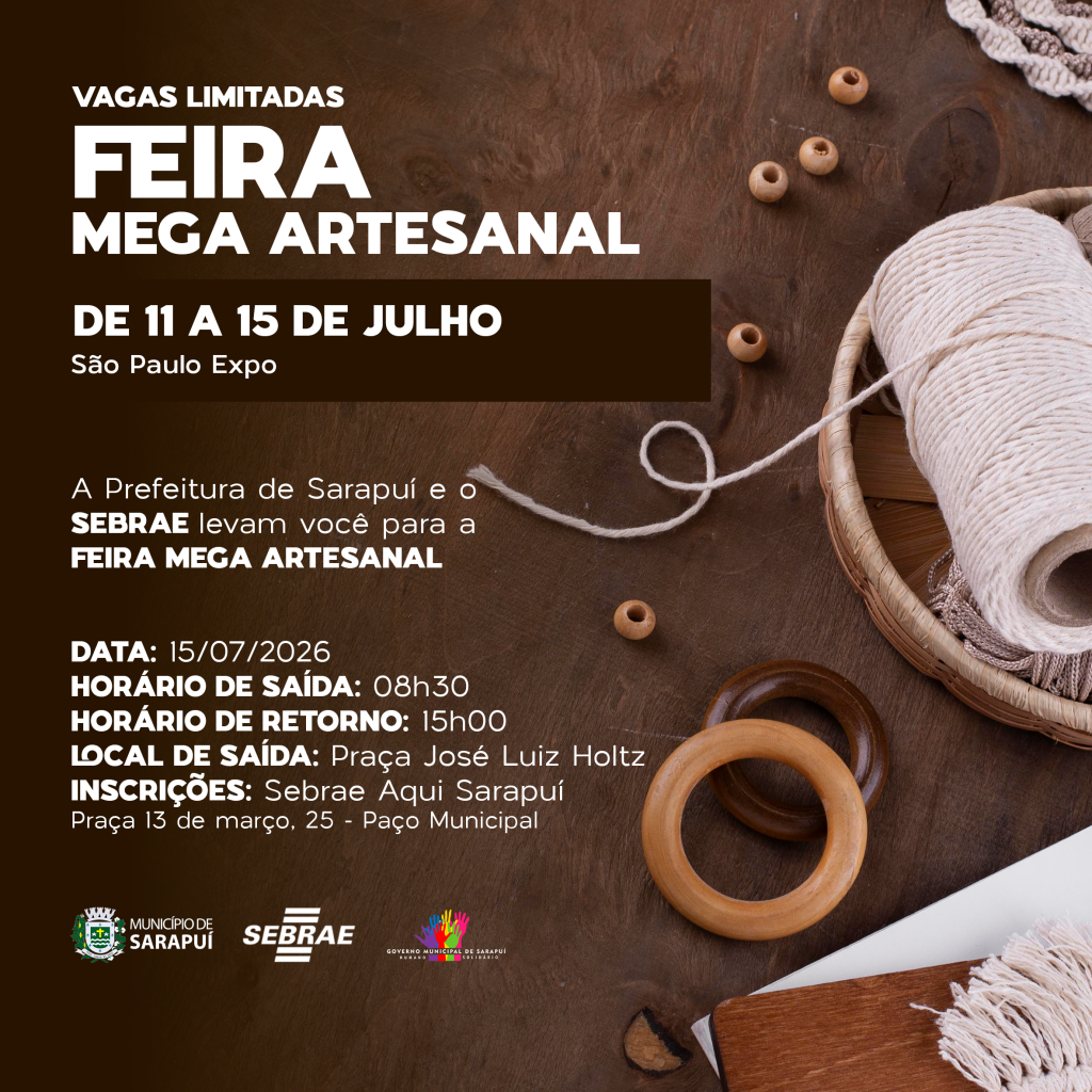 A Prefeitura Municipal de Sarapuí, em parceria com o SEBRAE, leva você para a Feira Mega Artesanal, um dos maiores eventos de artesanato do país!