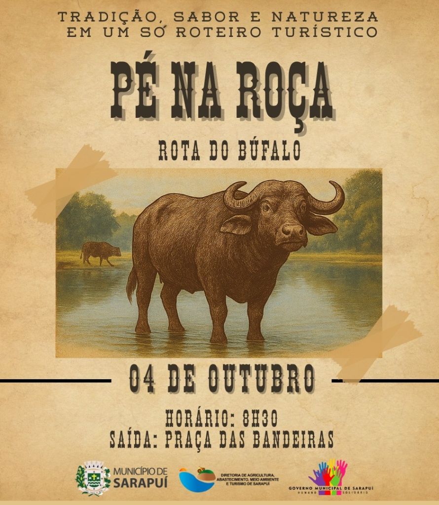 A Prefeitura Municipal de Sarapuí tem a honra de convidar toda a população para participar do evento “Pé na Roça – Rota do Búfalo”, que será realizado no dia 04 de outubro, com saída às 8h30, na Praça das Bandeiras.