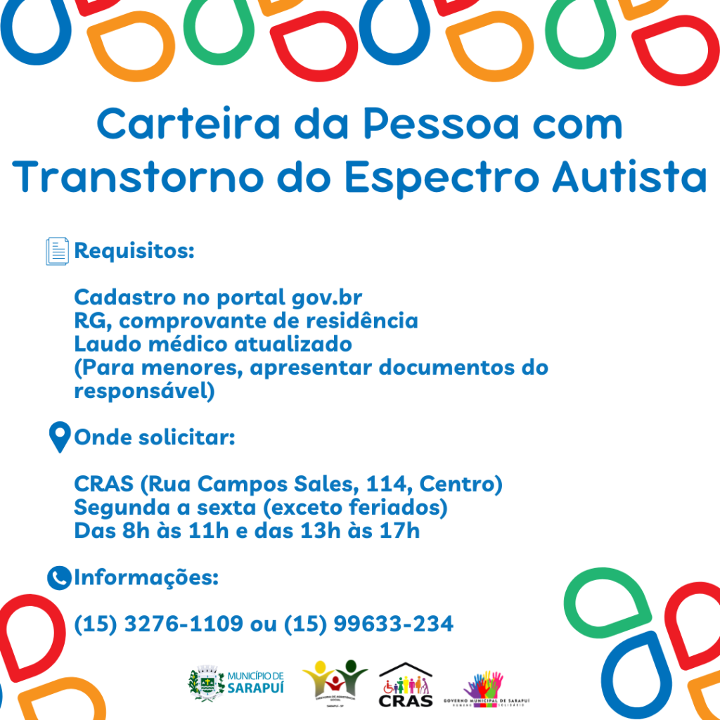 A Prefeitura Municipal de Sarapuí, por meio da Diretoria de Assistência Social, do Conselho Municipal da Pessoa com Deficiência (CMPD) e do Centro de Referência de Assistência Social (CRAS), informa que, a partir do dia 7 de outubro de 2025, passará a realizar a emissão da Carteira da Pessoa com Transtorno do Espectro Autista (CPTEA).