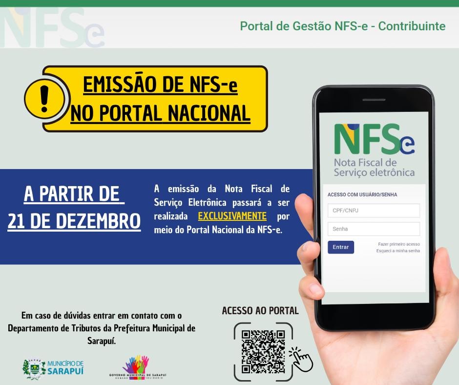A Prefeitura Municipal de Sarapuí informa que, a partir do dia 21 de dezembro de 2025, a emissão da Nota Fiscal de Serviço Eletrônica (NFS-e) passará a ser realizada exclusivamente por meio do Portal Nacional da NFS-e, da Receita Federal do Brasil, disponível no link: <https://www.nfse.gov.br/EmissorNacional>