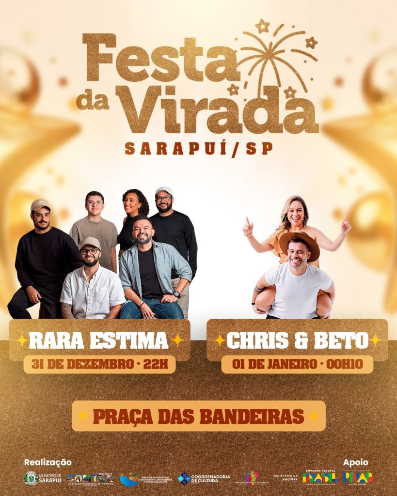 A Prefeitura Municipal de Sarapuí convida a todos para celebrar a chegada de 2026 com muita música, alegria e energia positiva! A festa começa no dia 31 de dezembro, às 22h, com show do grupo Rara Estima, que embala a última noite do ano com muita animação.
