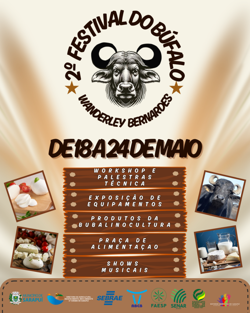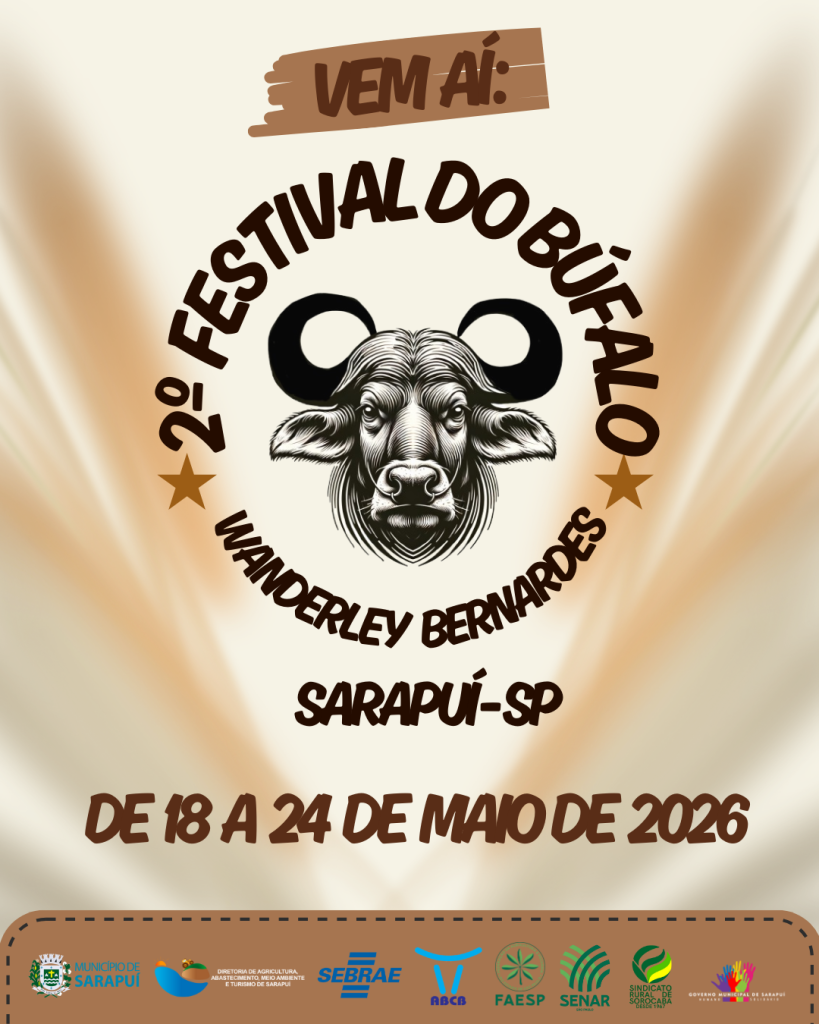 Entre os dias 18 e 24 de maio de 2026, Sarapuí recebe a segunda edição do Festival do Búfalo, no Centro de Eventos Wanderley Bernardes, reunindo conhecimento técnico, valorização da produção rural e fortalecimento da bubalinocultura.