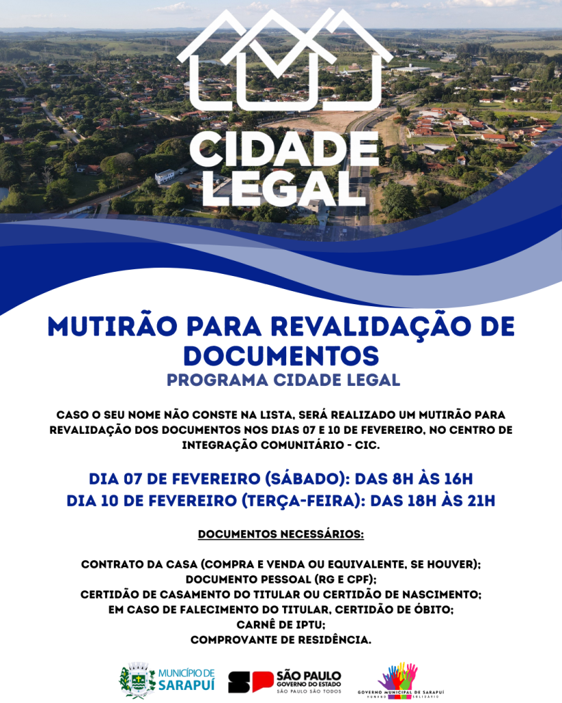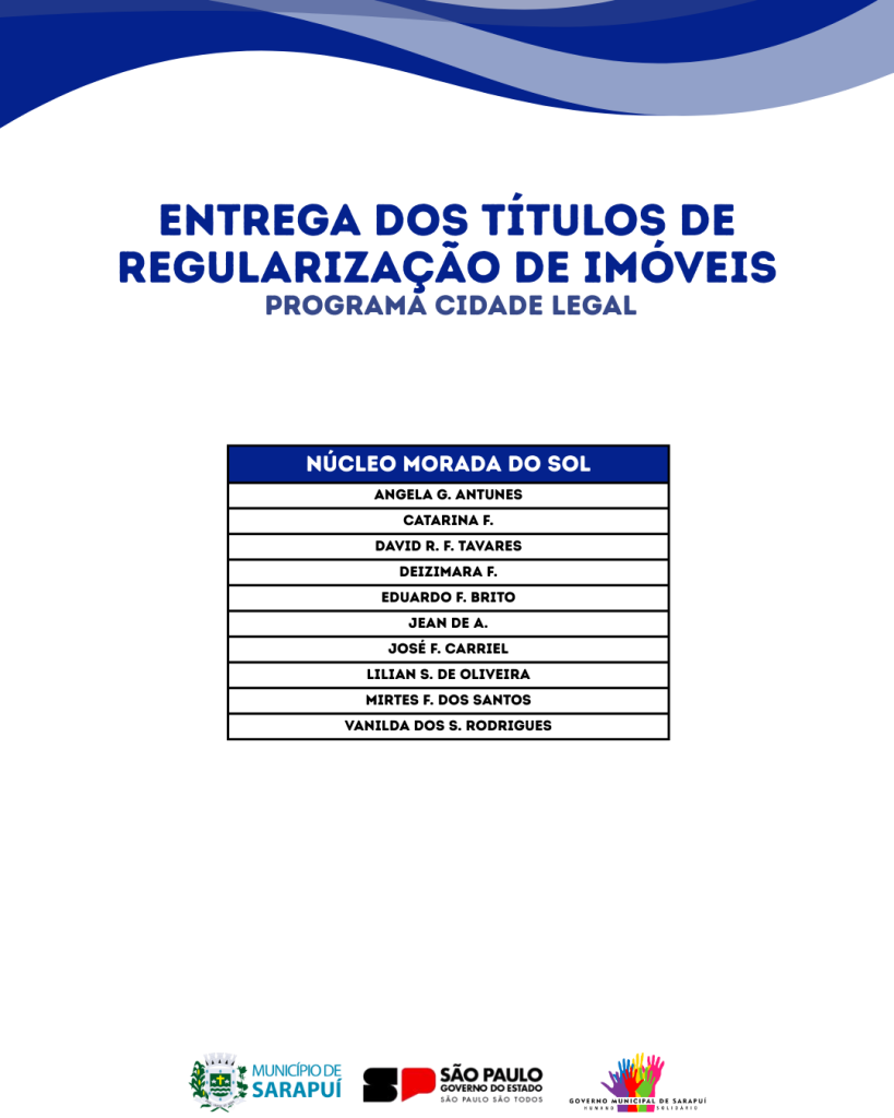 Você que se cadastrou no Programa Cidade Legal, chegou o grande momento! A Prefeitura de Sarapuí convida os moradores beneficiados nesta etapa para a entrega dos Títulos de Regularização Fundiária (Matrícula).