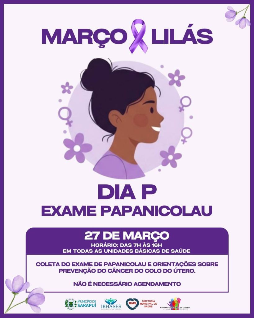 A Prefeitura Municipal de Sarapuí, por meio da Diretoria Municipal de Saúde e do Instituto IBHASES, convida todas as mulheres do município para participarem do Dia P do Exame Papanicolau, uma importante ação de prevenção e cuidado com a saúde da mulher, dentro da campanha Março Lilás.