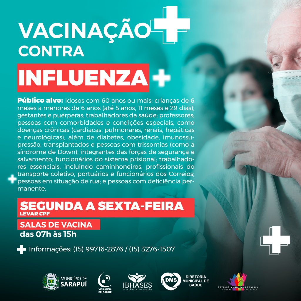 A Prefeitura Municipal de Sarapuí informa à população que a campanha de vacinação contra a influenza já está em andamento no município. A ação tem como objetivo proteger os grupos mais vulneráveis e reduzir complicações causadas pelo vírus, especialmente neste período de maior circulação da doença.