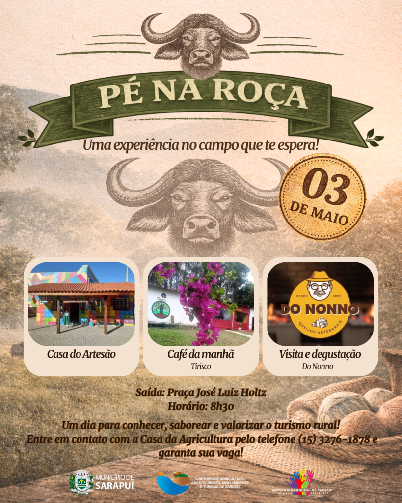 A Prefeitura Municipal de Sarapuí convida a população para o Pé na Roça, que será realizada no dia 03 de maio, com saída às 8h30, na Praça José Luiz Holtz.