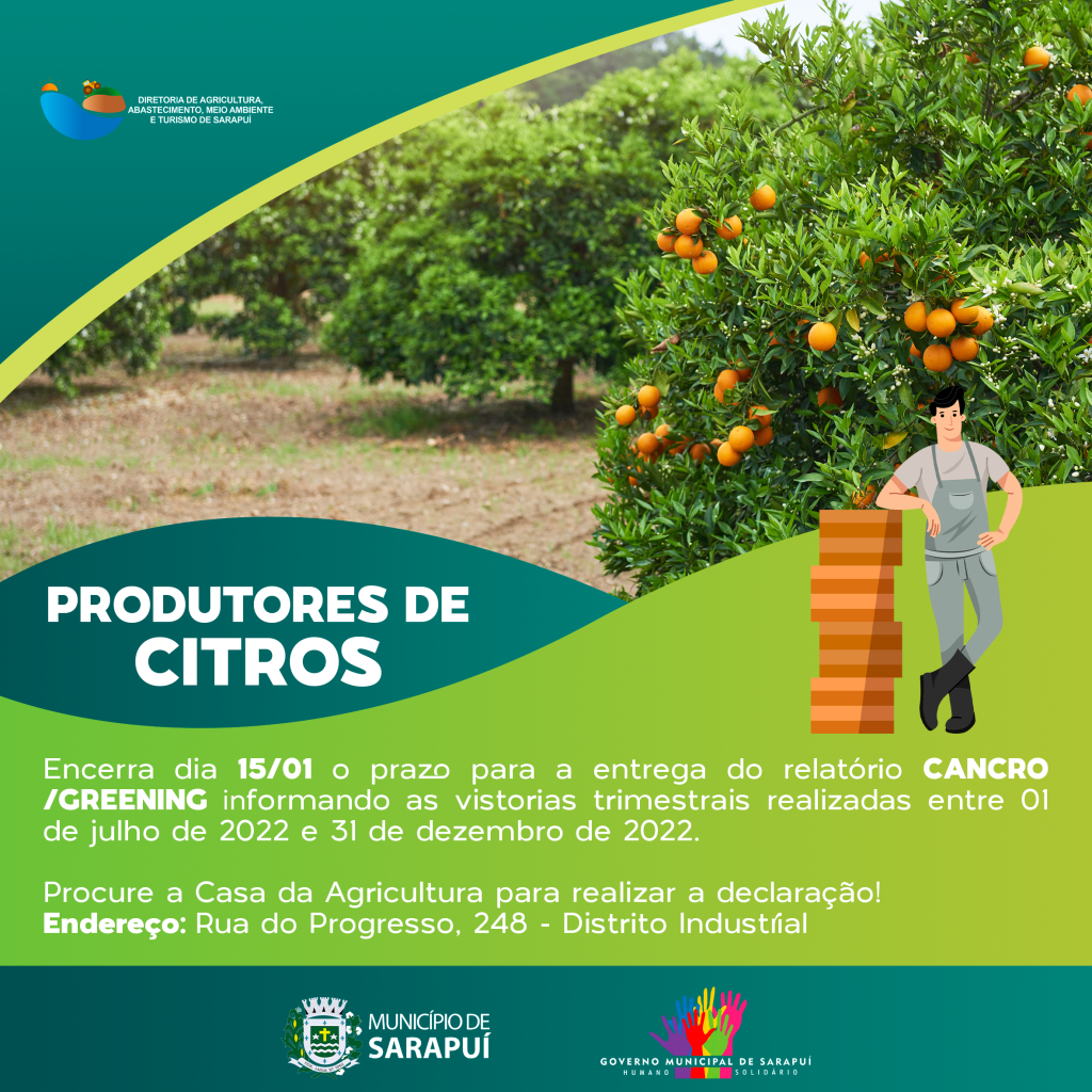 Encerra dia 15/01 o prazo para a entrega do relatório cancro /greening informando as vistorias trimestrais realizadas entre 01 de julho de 2022 e 31 de dezembro de 2022.
