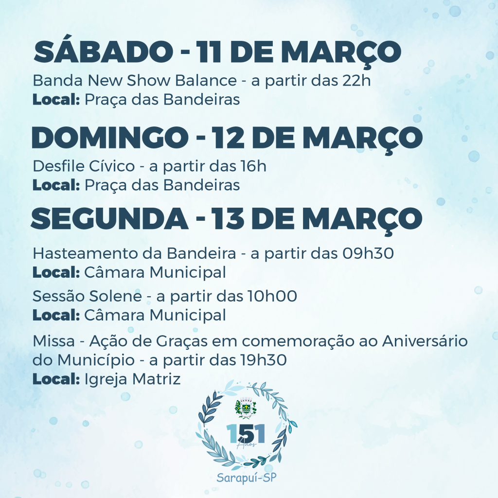 A Prefeitura Municipal de Sarapuí, tem a honra de convidar todos os munícipes para a comemoração dos 151 anos de emancipação política administrativa do município de Sarapuí!