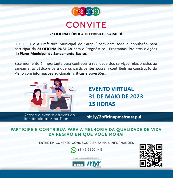 Para mais informações, acesse o site da revisão dos PMSB: www.pmsbceriso.com.br ou entre em contato através do telefone e canal de WhatsApp 31 99520 1415.